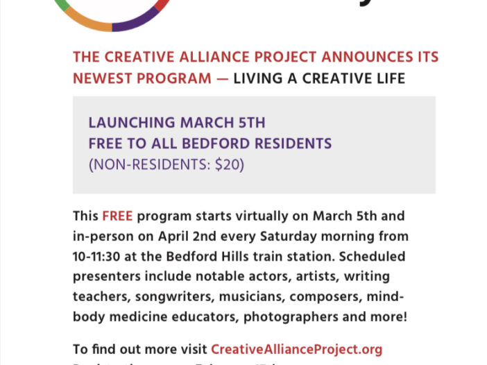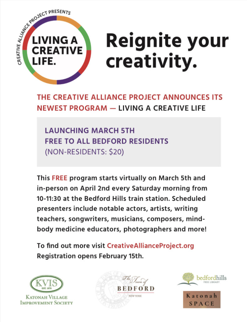 This FREE program starts virtually on March 5th and in-person on April 2nd every Saturday morning from 10-11:30 at the Bedford Hills train station. Scheduled presenters include notable actors, artists, writing teachers, songwriters, musicians, composers, mind-body medicine educators, photographers and more! http://www.CreativeAllianceProject.org