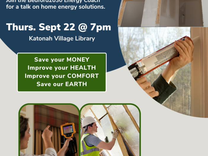 On Thursday, Sept 22 at 7pm, join Bedford2030’s Energy Coach, Bob Fischman, for a conversation about home energy. Whether you are a renter, home owner, building owner, realtor or property management company, join us to learn how building improvements can save money, save energy and increase resident comfort. Winter is around the corner, the time to make building improvements is now!