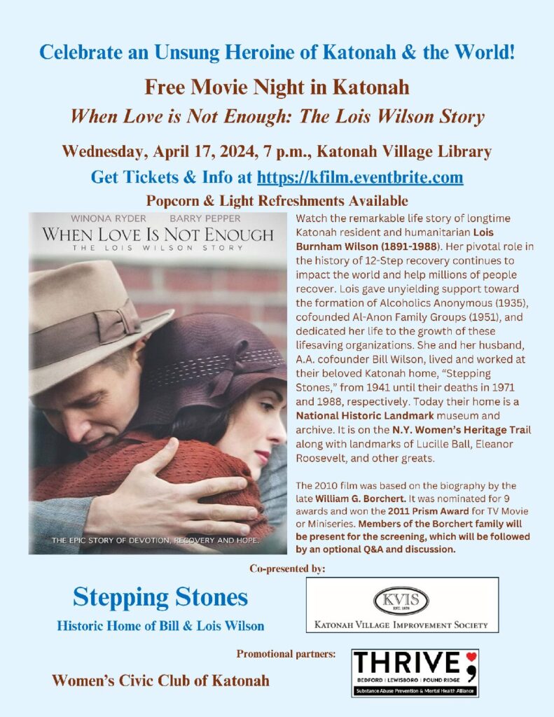 Celebrate an Unsung Hero of Katonah March 20, 2024 Free Movie Night in Katonah: When Love is Not Enough: The Lois Wilson Story Wednesday, April 17, 2024, 7 p.m., Katonah Village Library Get Tickets & Info at https://kfilm.eventbrite.com Popcorn & Light Refreshments Available