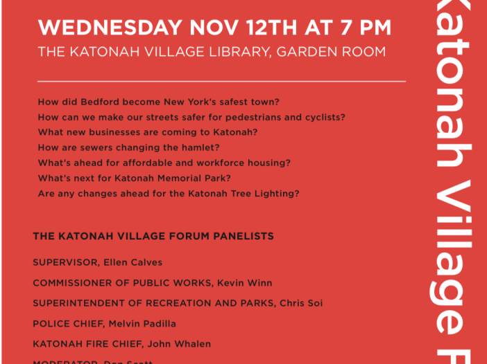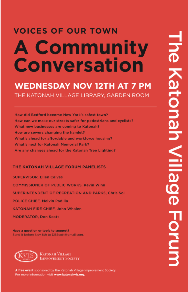 Katonah Village Forum: A Community Conversation November 3, 2025 Join us on Wednesday, November 12th at 7pm for a moderated forum with leaders from our town. Light refreshments will be served.